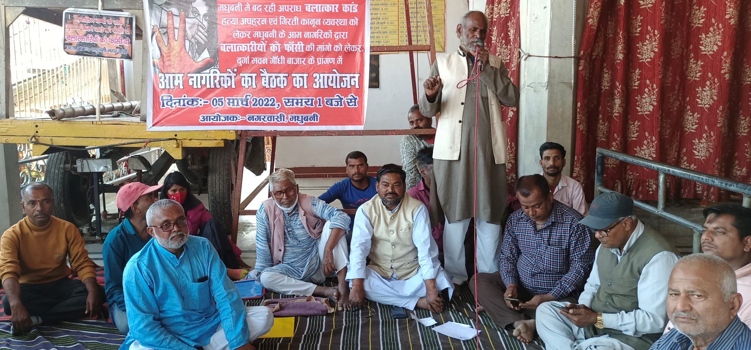 मधुबनी-05 मार्च। शनिवार को जिला मुख्यालय स्थित गिलेसन बाजार में सामाजिक न्याय के लिए स्थानीय दुर्गा मंदिर परिसर में आम नागरिकों की बैठक का आयोजन किया गया। जिसकी अध्यक्षता कुमार अवधेश एवं संचालन सत्यनारायण राय ने किया। वक्ताओं ने कहा कि मधुबनी जिला मुख्यालय में 25 फरवरी 22 को रात्रि पुरानी बस स्टैंड गंगासागर के पास नाबालिक लड़की के साथ आपराधिक तत्वों द्वारा सामूहिक बलात्कार किया गया। जिसके विरोध में मधुबनी शहर के आम नागरिक ने पुलिस प्रसासन के खिलाफ आंदोलन करने का एक शुर से प्रस्तव पारित किया। साथ ही पुलिस प्रसासन के मिली भगत से हो रही लूट, हत्या, अपहरण,डकैती व अन्य घटनाओं को लेकर आंदोलन की शुरूआत 8 मार्च को 11 बजे सुरी स्कूल के प्रांगण से विषाल जुलूस निकाल कर किया जाएगा। जुलूस शहर के विभिन्न मार्गों होकर जिला समाहरणालय मधुबनी के समक्ष धरना व प्रदर्सन करने का निर्णय लिया गया।