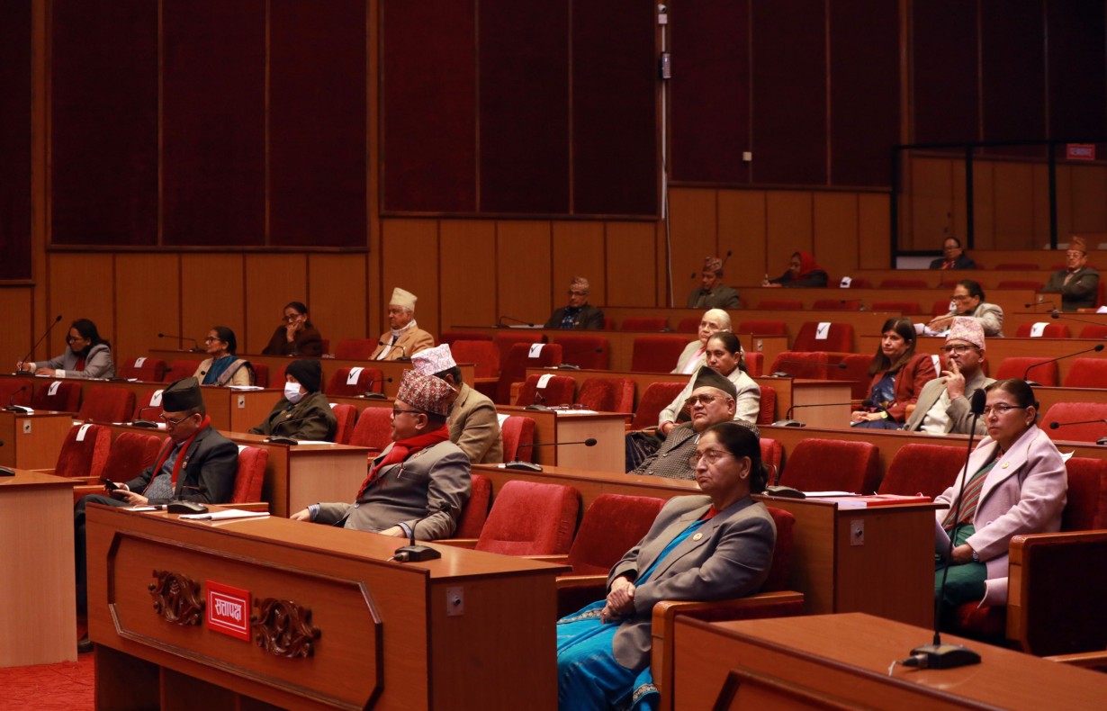 प्रतिनिधि सभा में आज सरकार की तरफ से सूचना तथा संचार मंत्री रेखा शर्मा ने राजनीतिक दल विभाजन संबंधी विधेयक को सदन के पटल पर रखा। थोड़ी देर तक इस पर चर्चा भी हुई लेकिन विधेयक पर मतदान के समय विपक्षी दलों के सांसद ने नियमापत्ति करते हुए गणपूरक संख्या की भी उपस्थिति नहीं होने के कारण मत विभाजन का विरोध किया। जिस समय इस विधेयक पर मतदान होना था, उस समय सदन में सांसदों की उपस्थिति सिर्फ 63 ही थी। नियमानुसार गणपूरक संख्या पहुंचाने के लिए कम से कम 69 सांसदों की उपस्थिति अनिवार्य होती है।