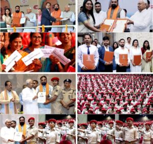 24 नवंबर 2005 को राज्य में जब नयी सरकार का गठन हुआ, तो हमलोगों ने युवाओं के लिए सरकारी नौकरी और रोजगार मुहैया कराने को लेकर एक ठोस नीति बनायी। इसके लिए सबसे पहले हमलोगों ने राज्य के अलग-अलग विभागों में खाली पड़े पदों पर बहाली का निर्णय लिया। वर्ष 2005 से 2020 के बीच राज्य में 8 लाख से ज्यादा युवाओं को सरकारी नौकरी और लाखों लोगों को रोजगार दिया गया। राज्य में और ज्यादा युवाओं को नौकरी और रोजगार देने के लिए हमलोगों ने रोडमैप तैयार किया और वर्ष 2020 में सात निश्चय-2 के तहत 10 लाख युवाओं को सरकारी नौकरी और 10 लाख लोगों को रोजगार देने का लक्ष्य निर्धारित किया गया। जब युवाओं को नौकरी और रोजगार के लिए चौतरफा काम शुरू हुआ, तो इसके सुखद परिणाम आने शुरू हो गये तथा आपको जानकर आश्चर्य होगा कि इन पांच वर्षों (वर्ष 2020 से 2025) में 10 लाख के बजाय 40 लाख लोगों को रोजगार दिया जा चुका है, जबकि 10 लाख युवाओं को सरकारी नौकरी भी दे दी गयी है। ऐसे में अब तक 50 लाख युवाओं को सरकारी नौकरी एवं रोजगार दे दिया गया है।