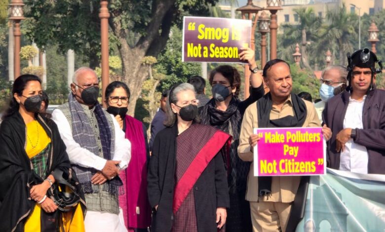 दिल्ली में खतरनाक प्रदूषण पर विपक्षी गठबंधन के सदस्यों का संसद परिसर में प्रदर्शन, सोनिया बोलीं- मुझे सांस लेने में दिक्कत