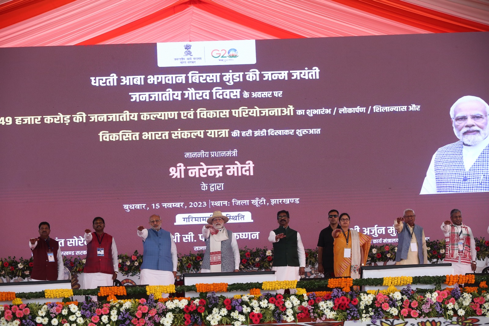 खूंटी (झारखंड)- 15 नवंबर। जनजातीय गौरव दिवस और भगवान बिरसा मुंडा की जयंती पर 15 नवंबर को प्रधानमंत्री नरेन्द्र मोदी ने 49 हजार करोड़ की जनजातीय कल्याण एवं विकास परियोजनाओं की सौगात दी। साथ ही विकसित भारत संकल्प यात्रा का आगाज किया। इसके अलावा पीएम जनजातीय आदिवासी न्याय महाभियान की शुरूआत की। उन्होंने आठ करोड़ लाभार्थियों के लिए पीएम किसान निधि की 15वीं किस्त भी जारी की।