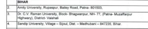 पटना- 26 सितंबर। विश्वविद्यालय अनुदान आयोग (UGC) ने एक सूची जारी की है, जिसमें देश भर के 54 निजी राज्य विश्वविद्यालयों (State Private Universities) को डिफॉल्टर घोषित किया गया है। इन विश्वविद्यालयों ने UGC के नियमों एवं आवश्यक दिशा-निर्देशों का पालन नहीं किया है। वहीं आयोग ने चेतावनी दी है कि इन विश्वविद्यालयों से डिग्री लेने वाले विद्यार्थियों को भविष्य में समस्या हो सकती है। छात्रों और अभिभावकों से अपील की गई है कि किसी भी प्रवेश से पहले विश्वविद्यालय की मान्यता और वैधता की जांच अवश्य करें। उक्त सूची में बिहार के तीन निजी विश्वविद्यालय शामिल हैं। उनमें Amiry University Patna, Dr C.V Raman University Vaishali एवं Sandip University Sijaul Madhubani शामिल है।