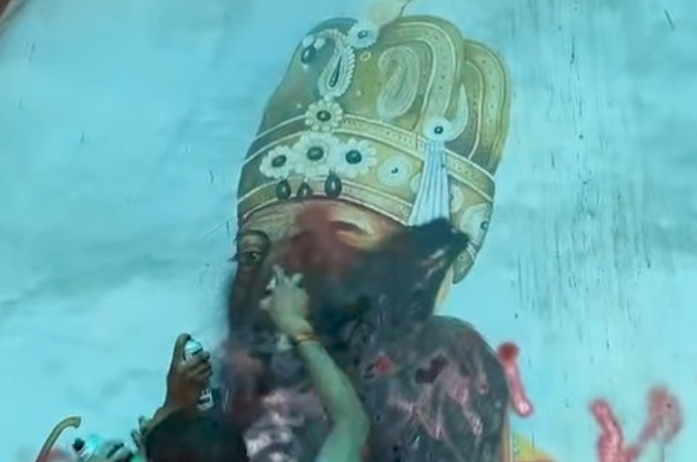हिंदू रक्षा दल के कार्यकर्ता भड़क गए और पेंटिंग पर कालिख पोत दी। हिन्दू रक्षा दल के कार्यकर्ताओं ने हंगामा कर इसे हटाने की मांग कर रहे हैं।