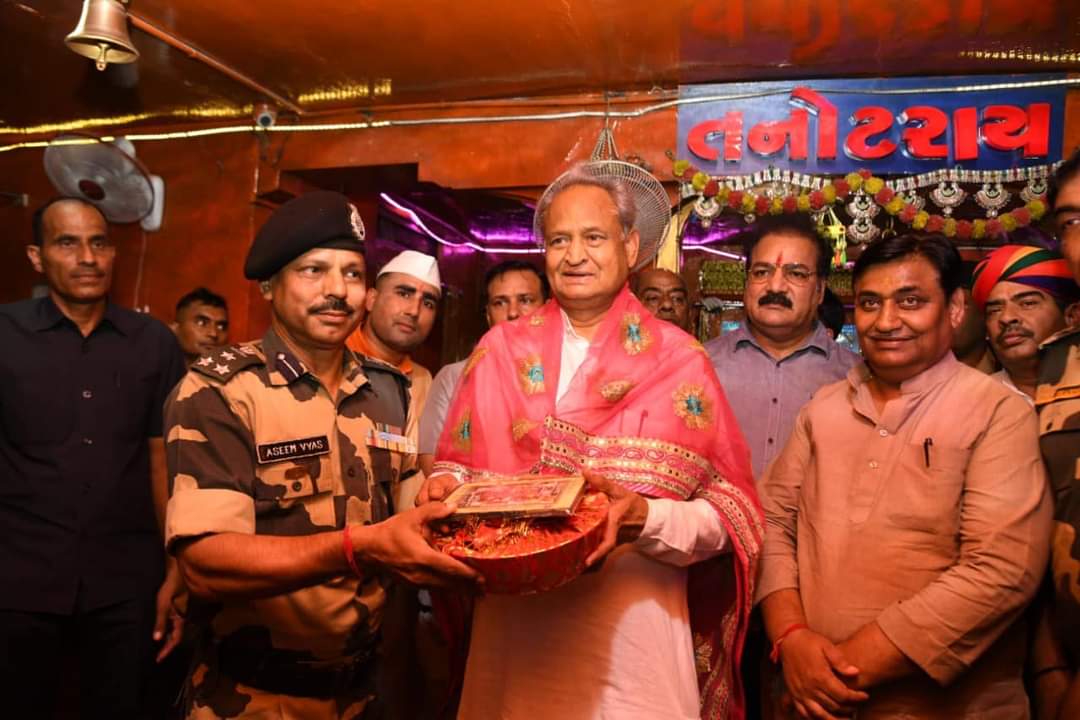 जैसलमेर- 25 सितंबर। मुख्यमंत्री अशोक गहलोत ने रविवार को जैसलमेर के सीमावर्ती तनोट क्षेत्र में तनोट मातेश्वरी मंदिर में माता के दर्शन किए। मुख्यमंत्री गहलोत जयपुर से स्टेट हैंगर से रवाना होकर जैसलमेर पहुंचे। उनके साथ प्रदेश अध्यक्ष गोविंद सिंह डोटासरा व मंत्री प्रताप सिंह खाचरियावास भी पहुंचे। जैसलमेर एयरपोर्ट पहुंचने के बाद हेलीकॉप्टर द्वारा मुख्यमंत्री का तनोट पहुंचने पर प्रशासनिक और सीमा सुरक्षा बल के अधिकारियों ने किया स्वागत किया। हेलीपैड से सीधे विजय स्तम्भ पहुंच उन्होंने शहीदों को पुष्पचक्र चढ़ा कर श्रद्धांजलि अर्पित की और फिर माता के दरबार में पहुंचे। जहां पुजारी मनीष ने अशोक गहलोत का तिलक कर अभिनन्दन किया। गहलोत ने विधिवत पूजा अर्चना की और माता के दर्शन किये। मुख्यमंत्री गहलोत की तनोट माता के प्रति गहरी आस्था व श्रद्धा है।