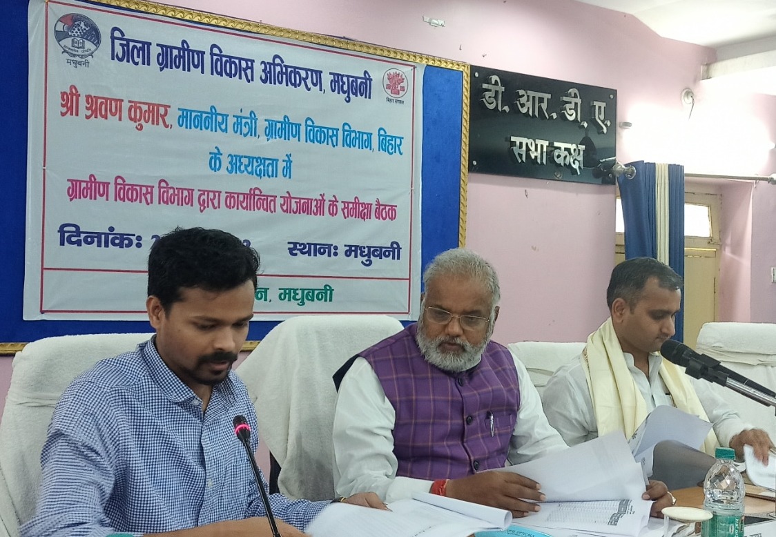 मधुबनी-26 अप्रैल। स्थानीय डीआरडीए के सभा कक्ष में ग्रामीण विकास विभाग के मंत्री श्रवण कुमार की अध्यक्षता में ग्रामीण विकास विभाग से संबंधित विभिन्न विकास एवं कल्याणकारी योजनाओं की समीक्षात्मक बैठक आयोजित हुई। बैठक में उप विकास आयुक्त विशाल राज ने जिले में संचालित ग्रामीण विकास विभाग की विभिन्न योजनाओं के संबंध में पावर पॉइंट प्रजेंटेशन के माध्यम से विस्तृत जानकारी दी।